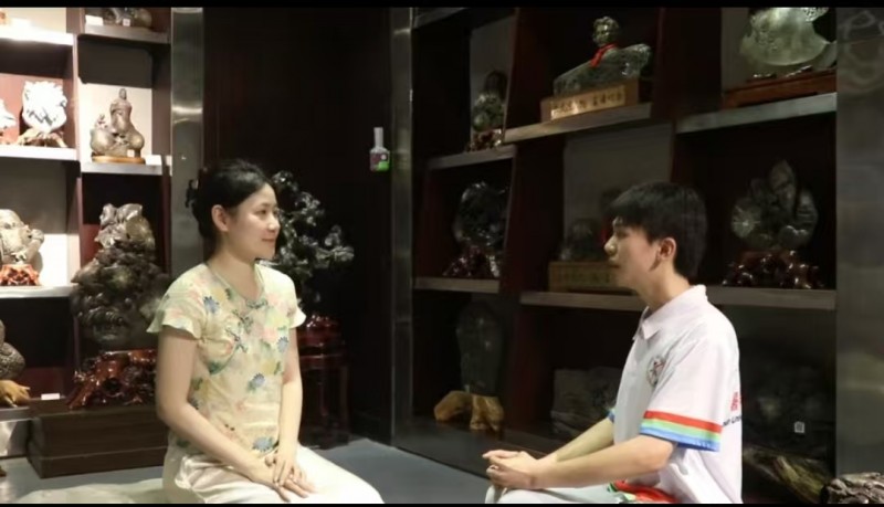 在永和菊花石博物館,田又銘與副館長謝致俐展開深度對話。這位"00后"非遺傳承人展示著鎮(zhèn)館之寶《秋菊傲霜》——2.5噸原石上268朵菊花,花瓣最薄處僅0.2毫米。謝致俐坦言:"經(jīng)濟(jì)收益固然重要,但非遺的傳承與保護(hù)更是無價之寶。"田又銘將這段對話融入實踐團(tuán)拍攝的《石中花語》紀(jì)錄片,通過深入非遺傳承第一線的考察與采訪,讓全球觀眾在云端"觸摸"菊花石的天然紋理。孩子們在博物館體驗區(qū)親手雕琢菊花石印章時,非遺的種子悄然生根。