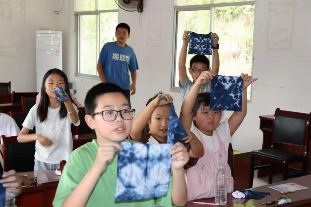 【圖2:孩子們舉著自己的“扎染”成果向著鏡頭展示】