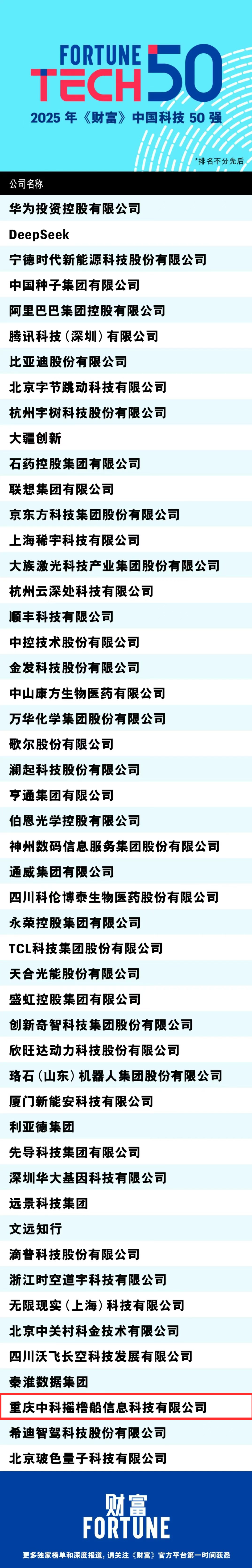 8月21日,全球最具影響力的商業(yè)媒體之一,《財富》(FORTUNE)發(fā)布“2025年《財富》中國科技50強”榜單。中科搖櫓船作為重慶唯一代表企業(yè)登榜!