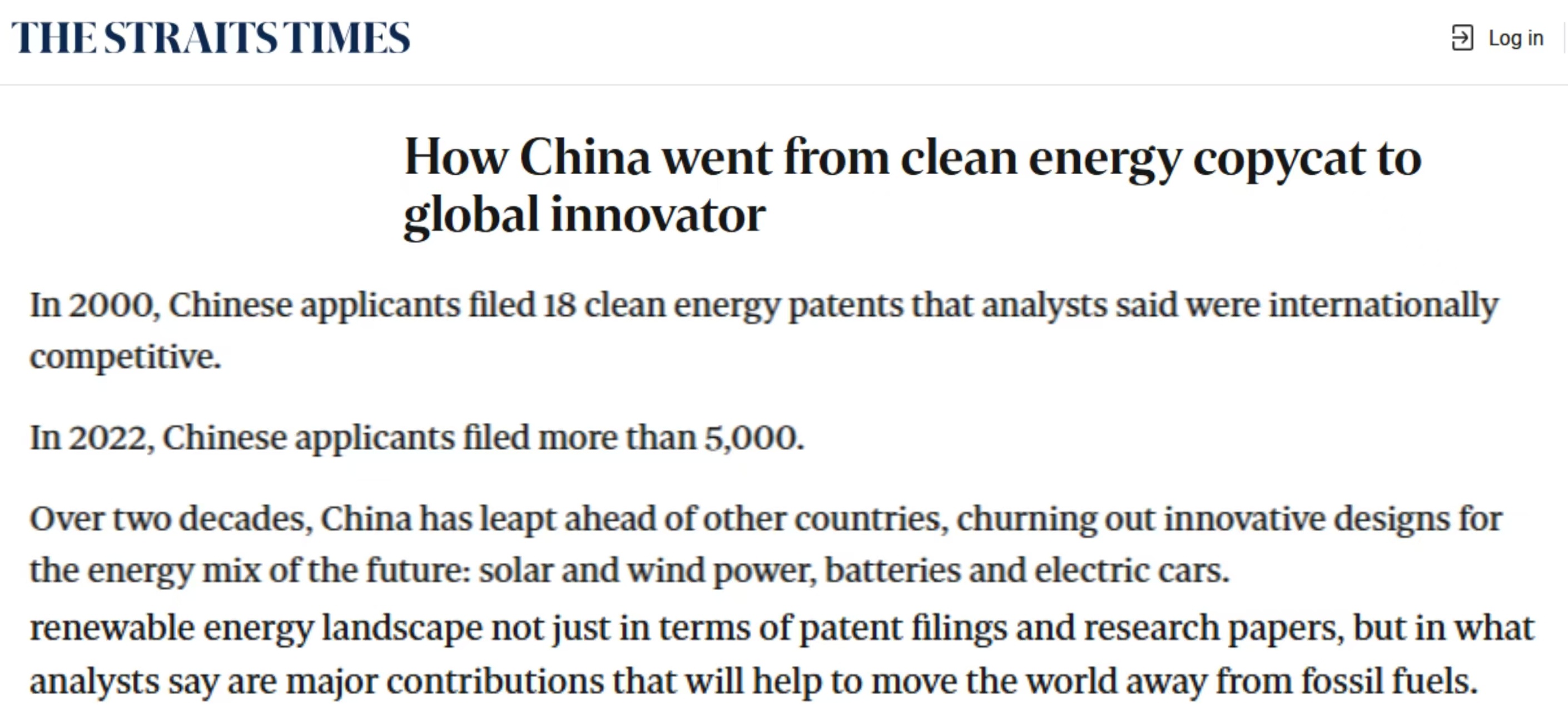近日刊發(fā)在新加坡《海峽時報》網站的一篇報道關注了中國清潔能源的發(fā)展。報道首先以一組數據分析稱,2000年,中國申請人提交了18項清潔能源專利,分析人士認為這些專利具有國際競爭力。到2022年,中國申請人提交的有關專利申請數量已超過5000件。