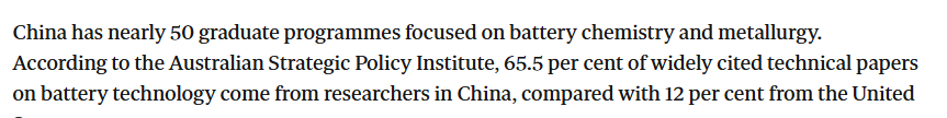這一轉變趨勢的形成,既源于中國的政策支持,也得益于中國學術研究環(huán)境的日益成熟。比如,中國有近50個專注于電池化學和冶金學的研究生項目。文章援引澳大利亞戰(zhàn)略政策研究所的數據:65.5%被廣泛引用的電池技術論文來自中國研究人員。