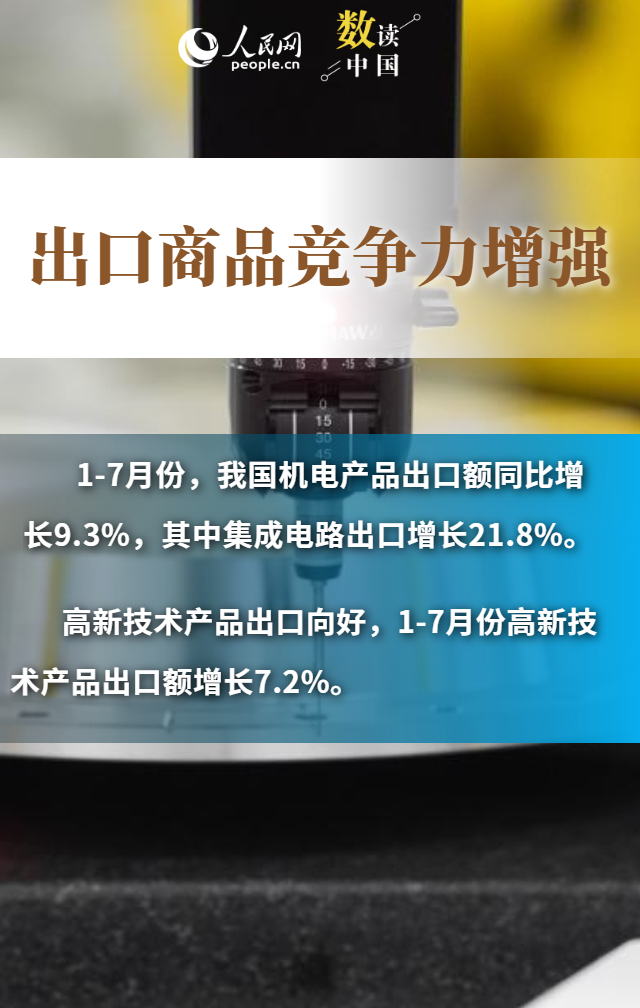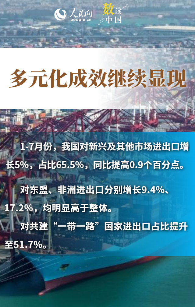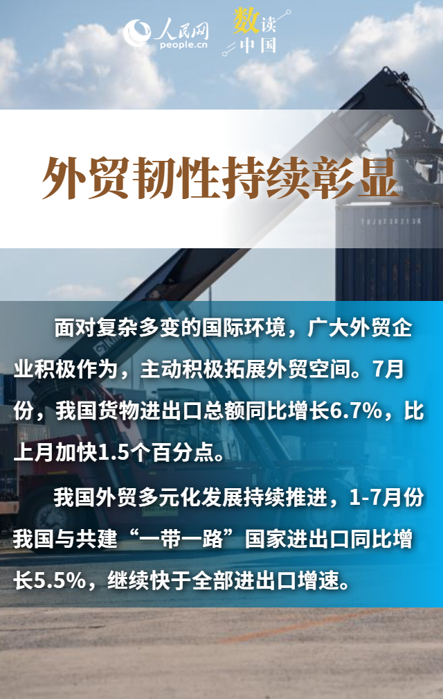 進出口規(guī)模創(chuàng)歷史新高、“朋友圈”不斷擴大、民營企業(yè)持續(xù)創(chuàng)新……數(shù)據(jù)顯示,今年前7個月,我國貨物貿(mào)易進出口總值25.7萬億元,同比增長3.5%。在外部挑戰(zhàn)之下,我國貨物進出口持續(xù)增長,展現(xiàn)出較強韌性和活力,為世界經(jīng)濟復(fù)蘇注入了中國力量。