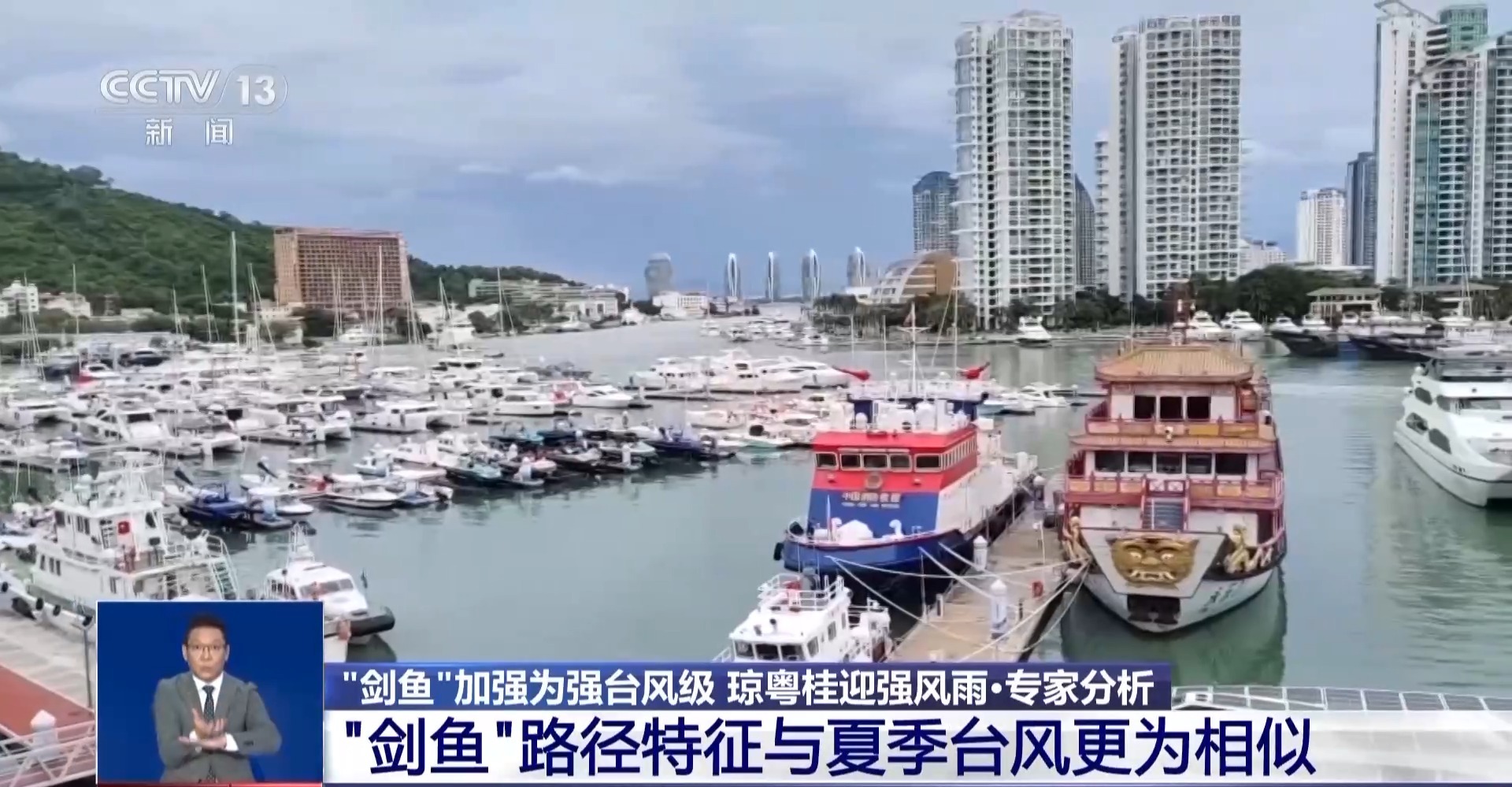 中央氣象臺首席預(yù)報員 向純怡:從今天白天開始,“劍魚”的外圍螺旋雨帶逐漸影響到海南島的東部和南部地區(qū)。從今天下午到夜間,臺風(fēng)的主體環(huán)流將逐漸影響海南南部沿海,雨勢和風(fēng)力會逐漸加大,降水主要出現(xiàn)在海南島的南部、東部以及粵西沿海。隨著它靠近北部灣后,廣西沿海也會出現(xiàn)降雨。