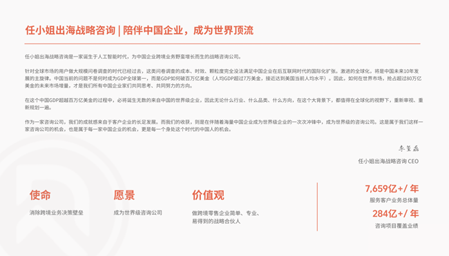 這個中國企業(yè)走向世界的偉大時代,任小姐出海戰(zhàn)略咨詢將繼續(xù)以科技驅動和系統(tǒng)化的戰(zhàn)略規(guī)劃,成為企業(yè)家們最值得信賴的戰(zhàn)略伙伴,共同書寫屬于中國跨境企業(yè)的世界級傳奇。