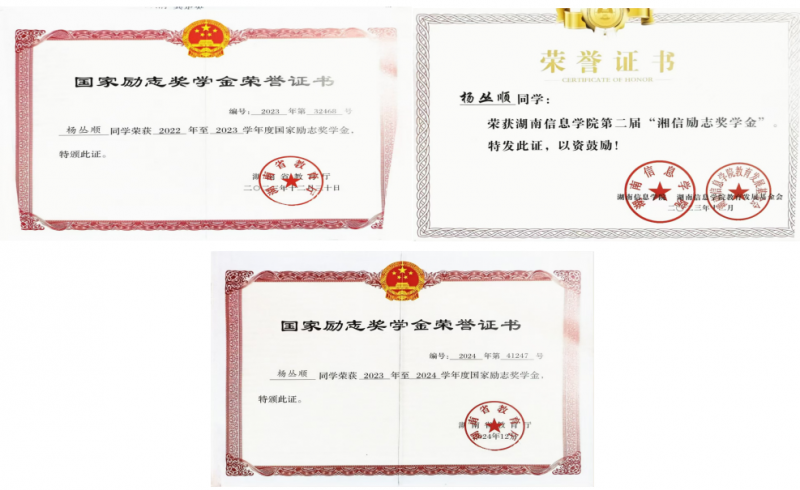 榮耀的勛章見(jiàn)證著奮斗的足跡:2023至2024年,她連續(xù)斬獲國(guó)家勵(lì)志獎(jiǎng)學(xué)金,2023年將湘信勵(lì)志獎(jiǎng)學(xué)金一并收入囊中。面對(duì)這些沉甸甸的榮譽(yù),楊叢順始終保持著清醒的認(rèn)知——獎(jiǎng)杯是里程碑而非終點(diǎn)站。她常說(shuō):"知識(shí)的海洋沒(méi)有彼岸,唯有以謙卑為舟,方能不斷抵達(dá)新的疆域。"這份求知若渴的態(tài)度,讓她在學(xué)術(shù)道路上步履不停。