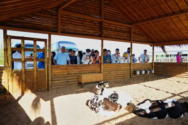 7月27日,當宣講團一行穿過烏蘭布和沙漠無垠的金色瀚海,所有人都被眼前的景象震撼:遠處沙丘的輪廓還帶著沙漠的粗獷,近處卻有奶牛在草地上甩著尾巴撒歡。23 座牧場上,11 萬頭奶牛在此悠然棲息,儼然是一片生機盎然的沙漠綠洲。