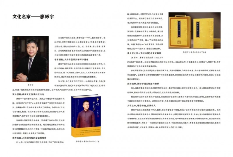 在當(dāng)代中國文化領(lǐng)域,廖彬宇先生是一位令人矚目的學(xué)者。在他20歲時(shí),時(shí)任中國新聞社社長(zhǎng)郭招金便以《天降其才耀中華》為題向世人推介這位青年才俊。近二十年來,他以學(xué)者、教育家、文化戰(zhàn)略家的多重身份活躍在文化傳承與創(chuàng)新的前沿,成為在全球化背景下構(gòu)建中國文化話語體系的重要踐行者。