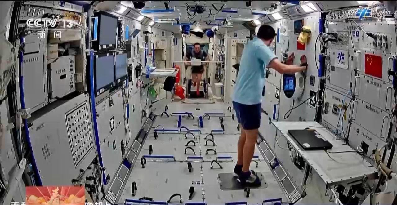歡樂的文藝表演過后,航天員也要開展日常生活與工作,鍛煉身體就是其中一項。