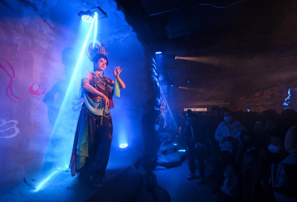 馬年春節(jié)期間,寧夏銀川市賀蘭山下格外熱鬧。走進(jìn)西夏陵博物館后數(shù)百米長的廊道,游客仿佛穿越回千年前的西夏——身著各民族傳統(tǒng)服飾的“商賈”沿街叫賣,“麻魁”女兵英姿颯爽,西夏壁畫中的“飛天”在神秘?zé)熿F與燈光中翩躚起舞……